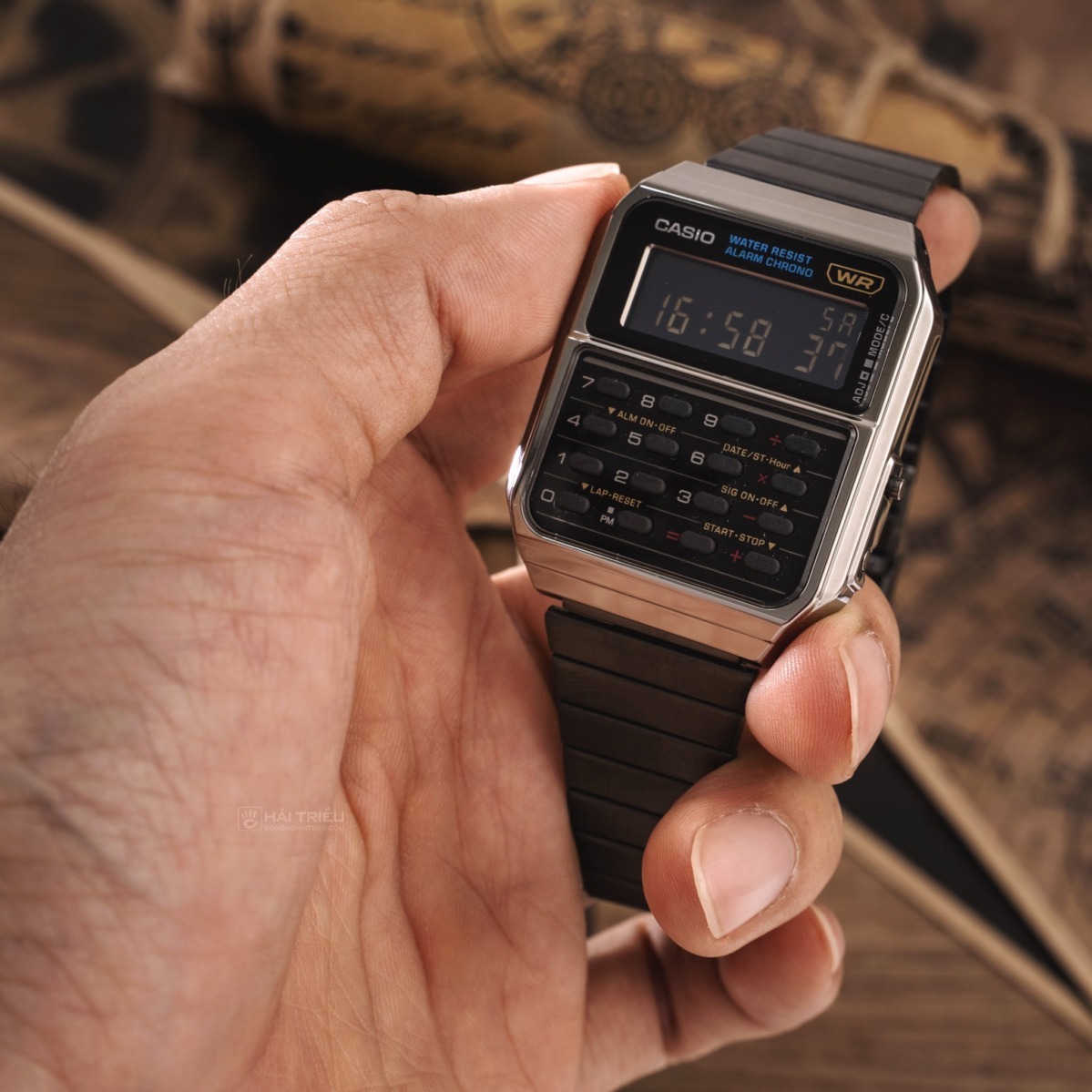 Casio CA-500WEGG-1BDF là mẫu đồng hồ nam mang đậm phong cách thập niên 1980, kết hợp giữa thiết kế cổ điển và công nghệ hiện đại. Với kích thước mặt số 43.2mm, chiếc đồng hồ này sở hữu màn hình kỹ thuật số rõ nét, giúp hiển thị thời gian chính xác nhờ bộ máy Quartz (Pin) bền bỉ. Điểm nổi bật của sản phẩm là máy tính 8 chữ số tích hợp, cho phép thực hiện các phép toán đơn giản ngay trên cổ tay, cùng với tính năng bấm giờ tiện lợi.